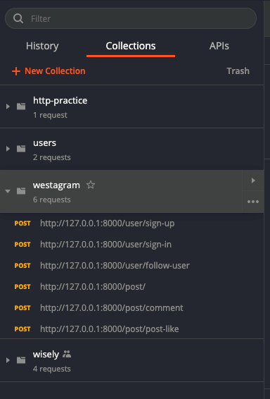 새로운 Collection을 만들기 위해서는 탭 이동이 필요합니다. 사진의 좌측에서 Collections를 눌러줍니다. 그다음 New Collection을 클릭합니다. 저의 경우에 기존에 만들어 놓았던 API collection이 있어서 하단과 같이 뜨네요.