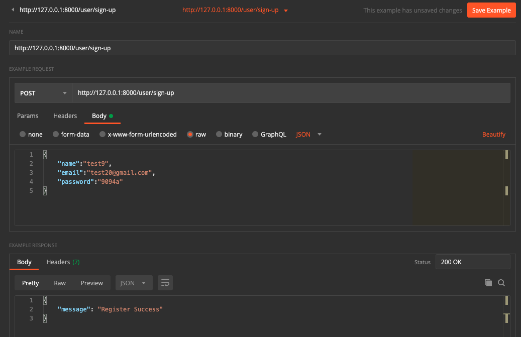 이제 문서작성 시 Example Response를 저장해보도록 하겠습니다. 아래 사진처럼 Save Response로 저장하면 됩니다.