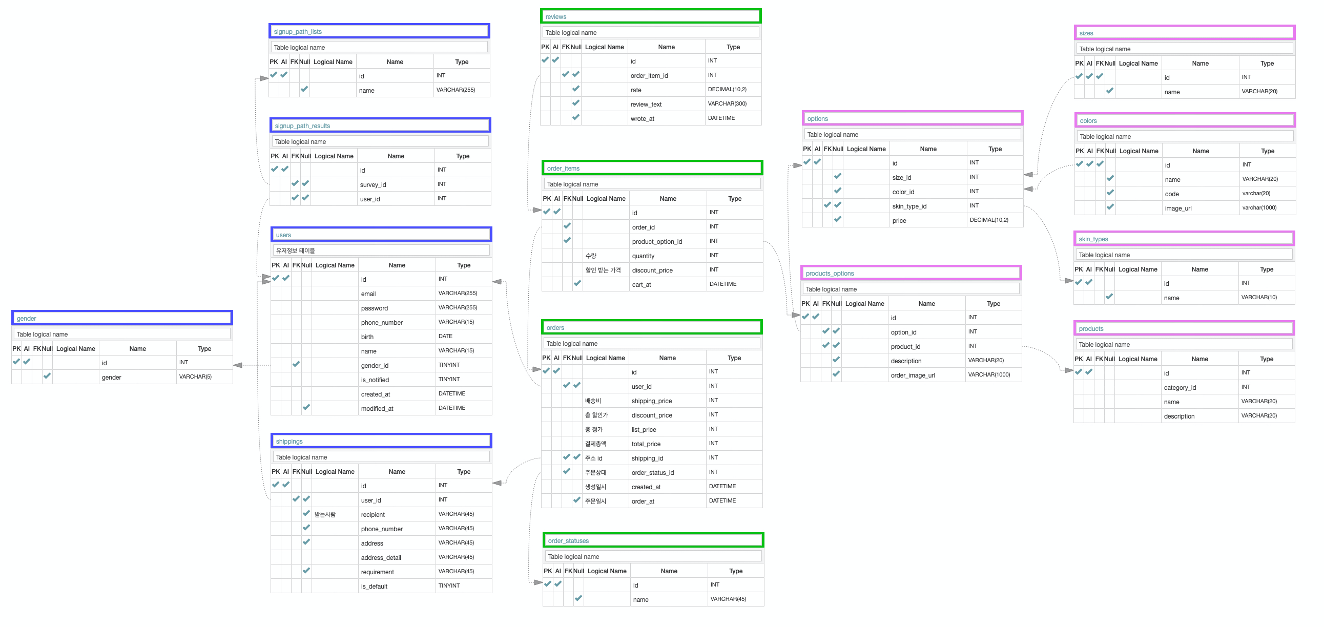 즉, 3개의 구매방식(색상 고르는 제품, 아무것도 선택하지 않는 면도날, 사이즈를 선택하는 피부제품(skintype은 종속시킴))의 테이블(products_colors, blade_products, products_sizes)로 나뉘던 테이블을 products_options라는 테이블로 단일화된 것입니다. 이렇게 만들면 편의상 size에 종속시켰던 skintype 또한, 개별로 둘 수 있어 제품 변경에 대한 대응이 가능합니다.